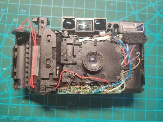 After removing the other visible screws on the front, the axis and lens can be removed, revealing the circuit board underneath. Two wires on the left side of the circuit board connect to the battery compartment. Above, the flash, indicator lights, film remaining display, and other components are connected.