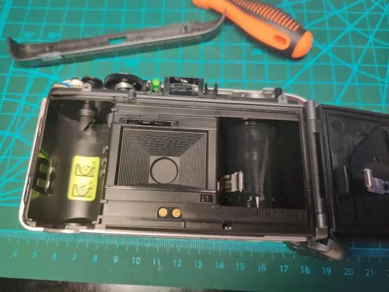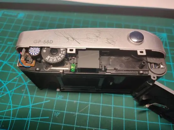 After removing the top cover, you can see physical display dials on the left side showing the film roll rotation and the remaining film quantity. It is presumably connected by gears, and the film display dial completes exactly one revolution after the entire roll of film has finished spinning. The image in the middle is a lens viewfinder.