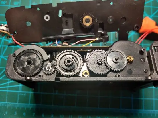 Below the camera is a large set of gears used to move the film and record data. Remove the gears, then remove the screw on the right side to reveal the motor located beneath them; this is the power source that drives the film.